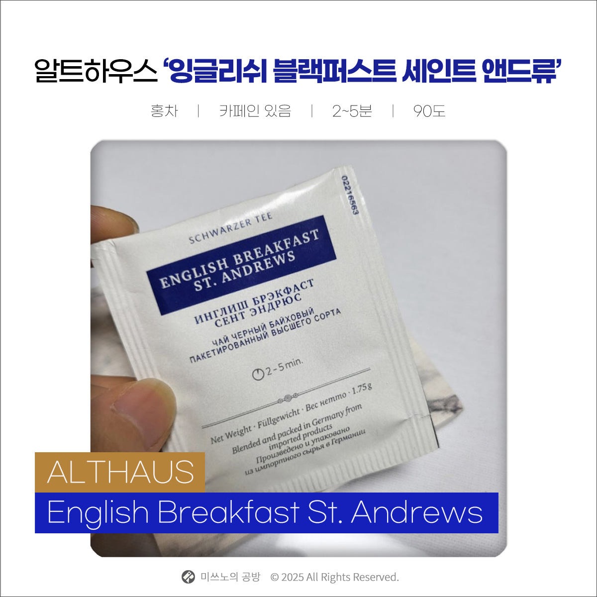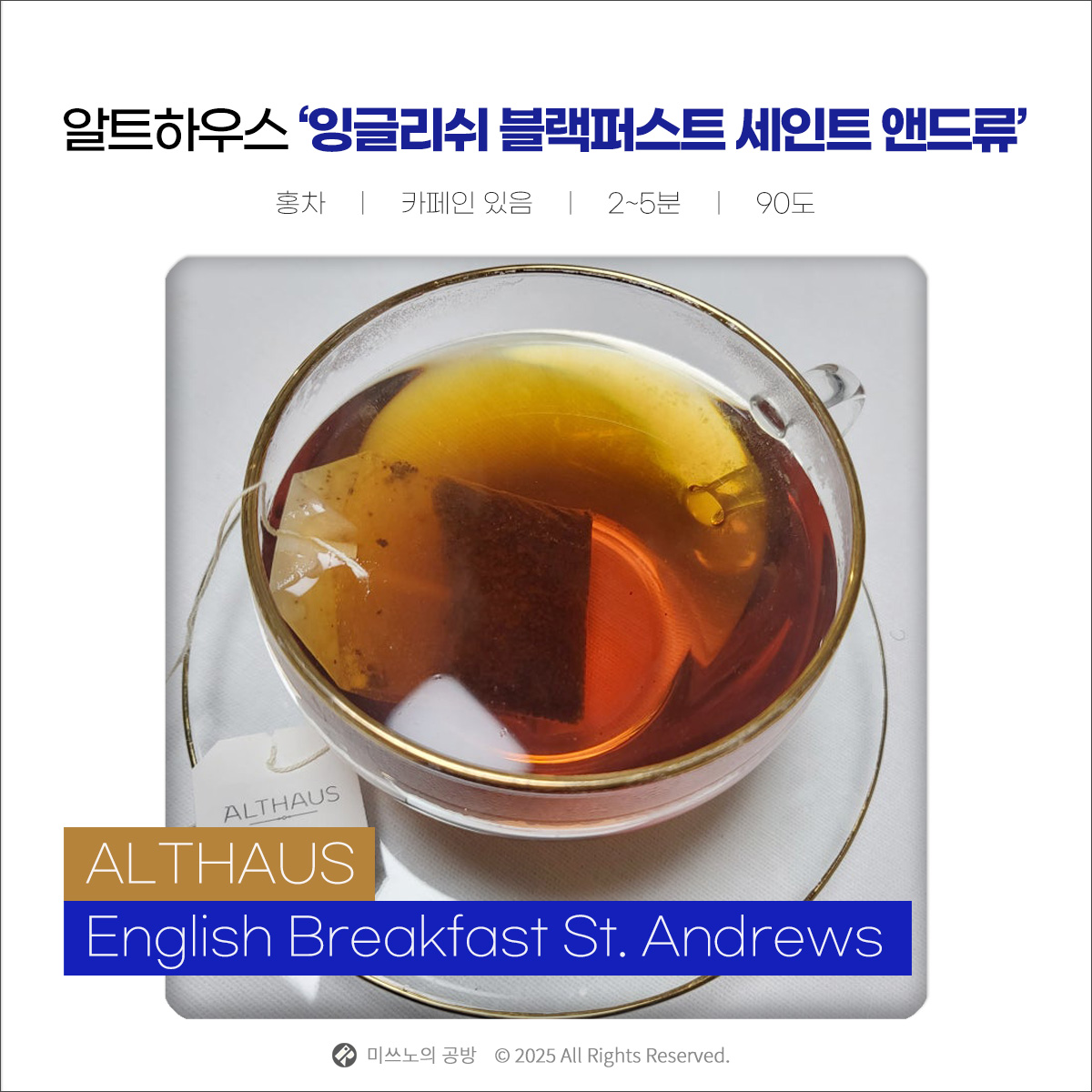 알트하우스 잉글리쉬 블랙퍼스트 세인트 앤드류는 군더더기 없는 깔끔한 브랙퍼스트 티로, 부드럽고 은은한 다즐링의 첫맛과 아쌈 특유의 깊은 여운을 동시에 즐길 수 있는 차입니다.
