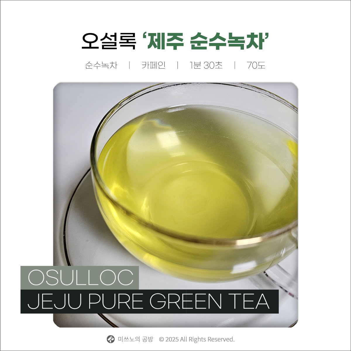 오설록의 제주 순수녹차는 유기농 차밭에서 채취한 어린 찻잎으로 만든 깔끔한 녹차입니다. 같은 어린잎 녹차인 세작과 비교했을 때, 세작이 프리미엄 라인이라면 제주 순수녹차는 가성비 라인이라고 볼 수 있습니다.