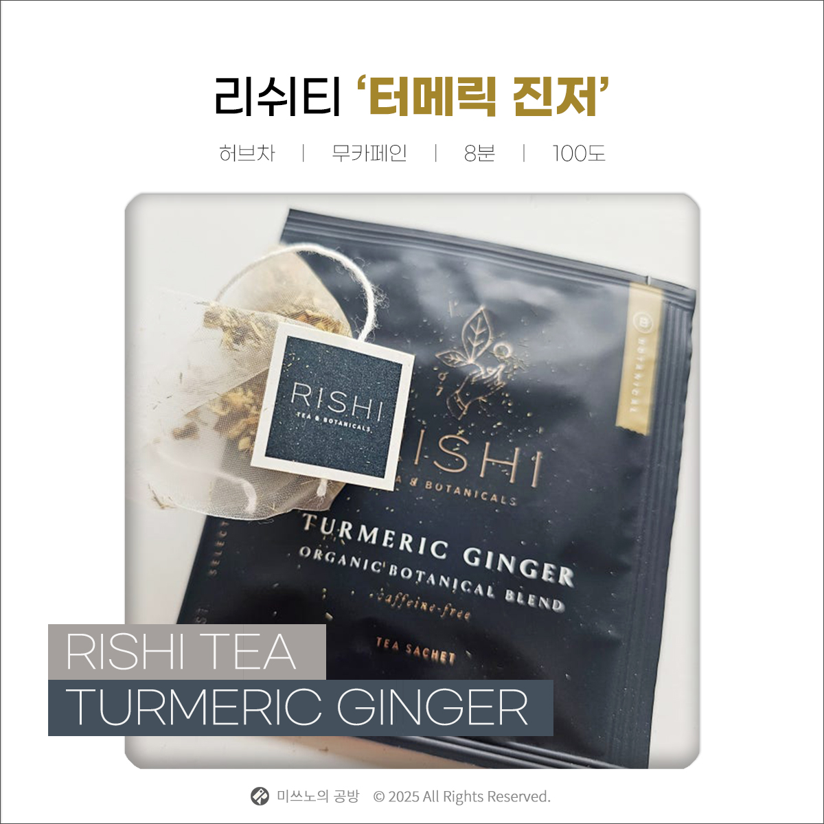 리쉬티 터메릭 진저는 생강의 강렬한 향과 강황의 깊은 풍미가 어우러진 건강한 허브티입니다.