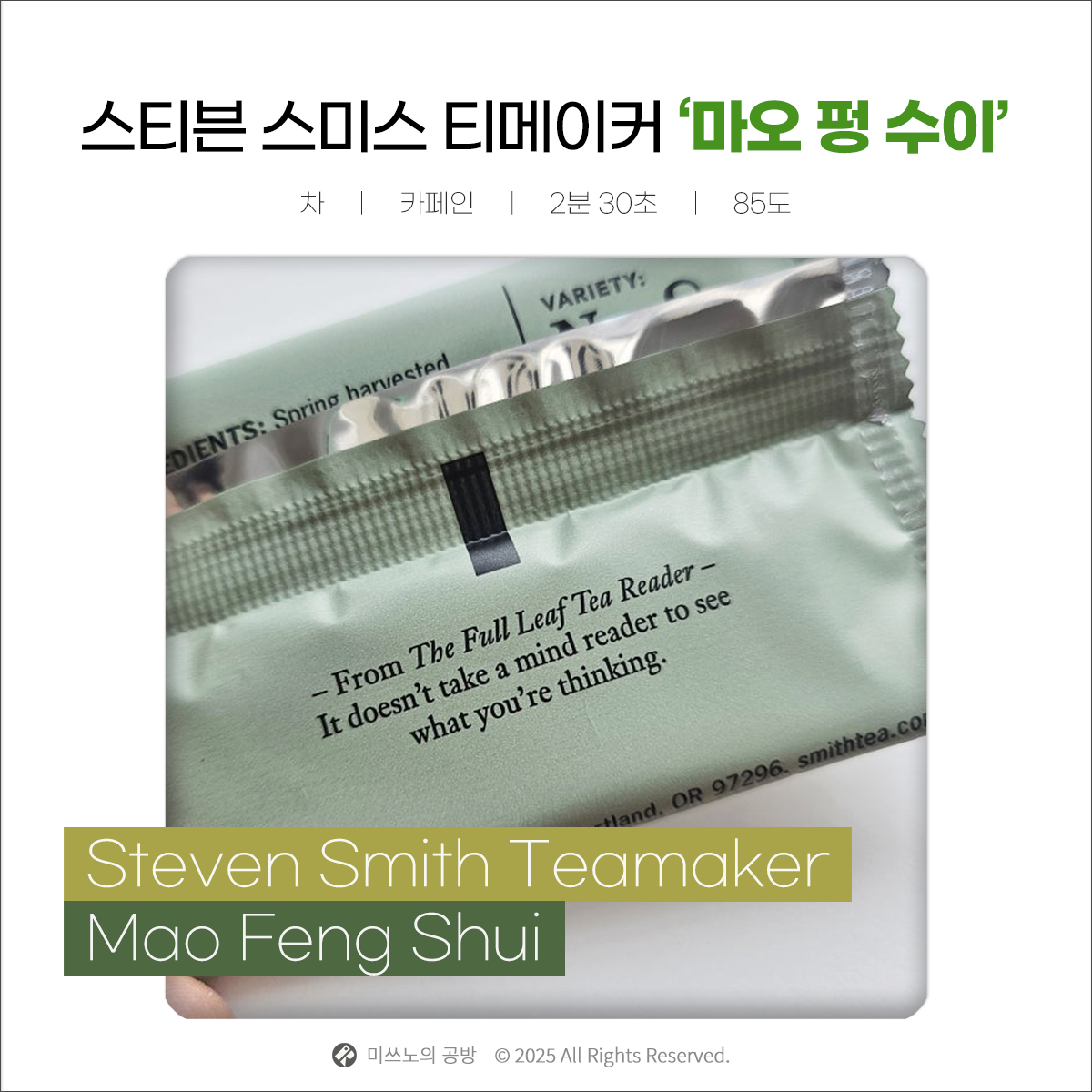 브랜드 : 스티븐 스미스 티메이커(Steven Smith Teamaker) 상품명 : 마오 펑 수이(Mao Feng Shui) 차 종류 : 녹차(Green Tea) 카페인 여부 : 카페인 있음 원산지 : 중국 황산 우림 시간 : 2분 30초 물 온도 : 85도 주재료 : 녹차 100% 가격대 : 약 25,000원~30,000원(온라인 평균 가격) |