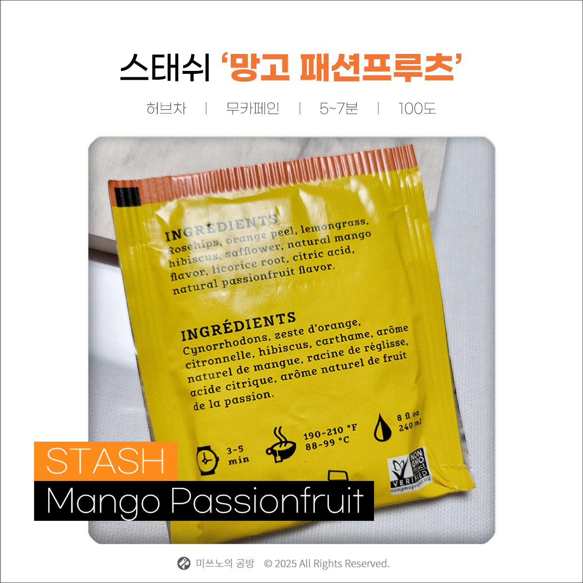 과일차를 좋아하는 분이라면 스태쉬 망고 패션프루츠(STASH-Mango Passionfruit)는 꼭 한 번 경험해볼 가치가 있습니다.